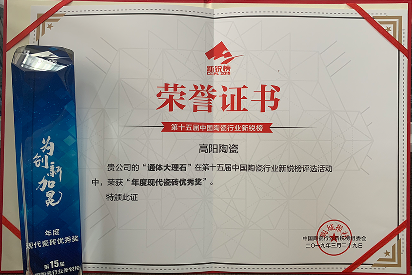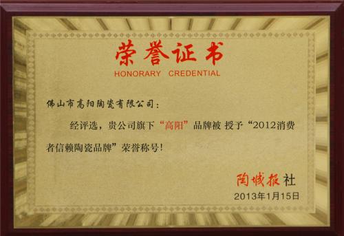 2013年高陽(yáng)陶瓷被授予“2012消費(fèi)者信賴(lài)陶瓷品牌”榮譽(yù)稱(chēng)號(hào)