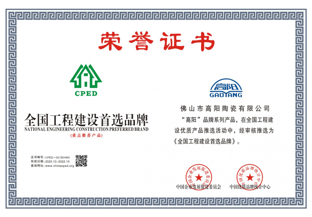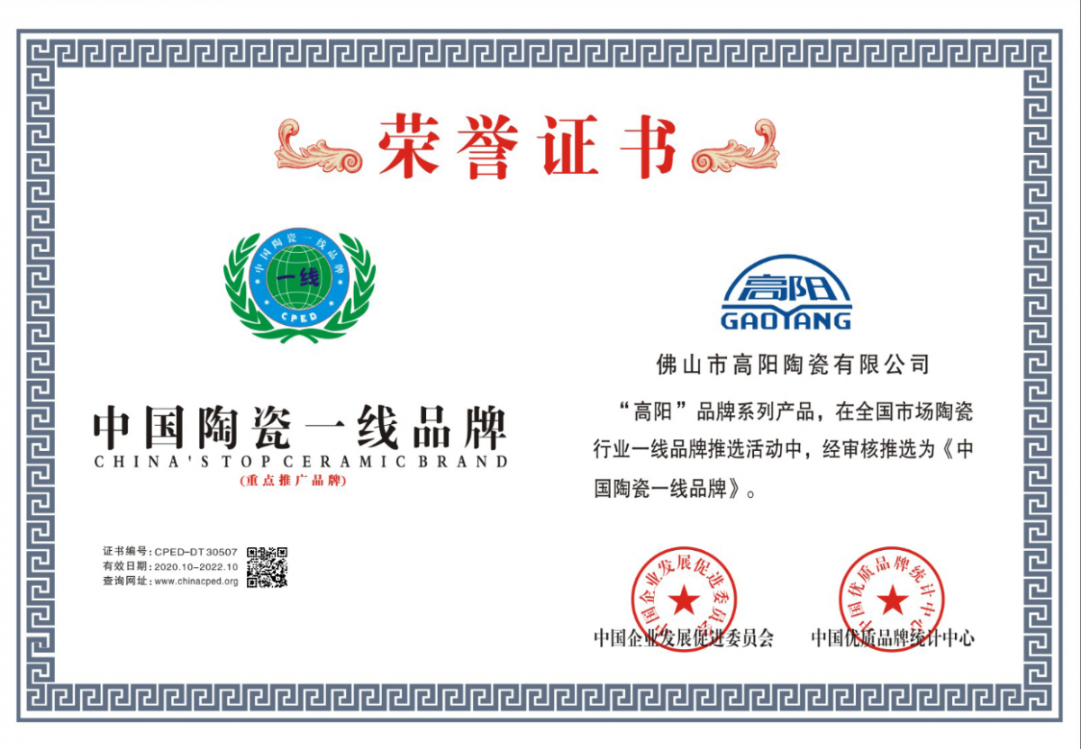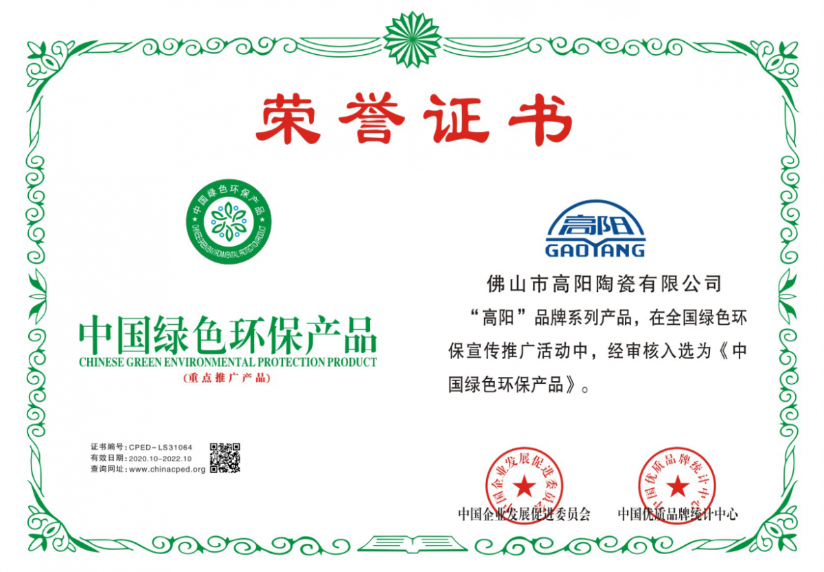 智能制造·國(guó)標(biāo)認(rèn)證,高陽(yáng)陶瓷憑借強(qiáng)大的制造實(shí)力與精益求精的匠人精神,全系產(chǎn)品嚴(yán)格通過(guò)國(guó)家3C認(rèn)證、ISO9001:2000國(guó)際質(zhì)量體系認(rèn)證,并先后榮獲“中國(guó)著名品牌”“中國(guó)陶瓷一線品牌”“中國(guó)環(huán)保綠色產(chǎn)品”“陶瓷品牌100強(qiáng)”“全國(guó)工程建設(shè)首選品牌”等榮譽(yù)。